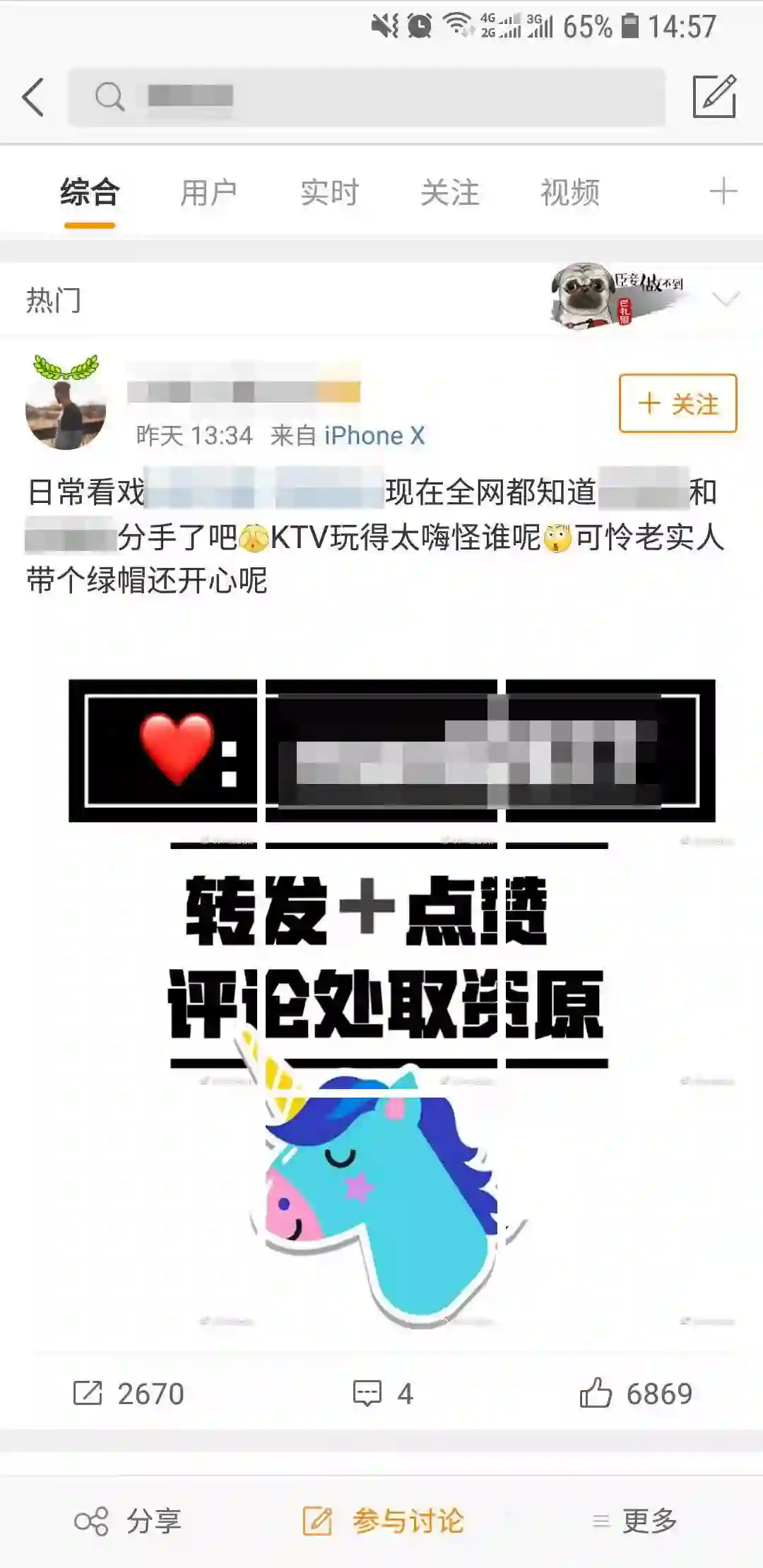 首先用一个加V微博发布内容,微博内容包含搜索时输入的敏感词汇,或者和花边新闻相关(上面我们提到的小红小黑事件)