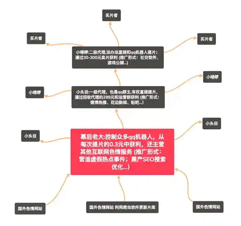 我简单画了一个结构示意图,将整个产业链条曝光出来,包括供片渠道、组织结构、盈利方式、推广模式等等。