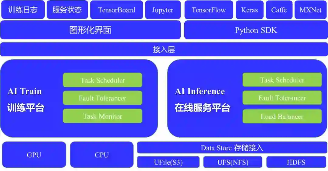 公有云的AI平台是基于UCloud自己的公有云产品线上构建的,完全是在UCloud的云主机或者物理云主机上搭建环境,用的容器及负载均衡也都是UCloud本身提供的服务。整个系统的架构如下图示: