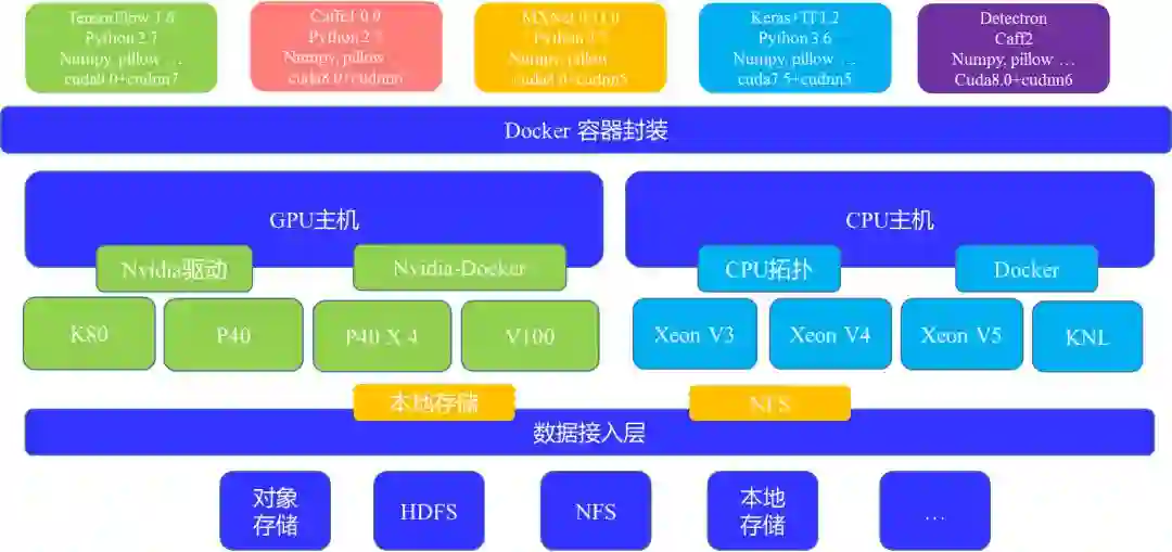 环境分离的第二部分是数据接入。我们团队在整个平台设计过程中的理念就是让使用者专注于业务程序的编写,其它如接口转译、带宽控制、权限控制等交由一个软件接入层去管理。这样的好处第一,计算节点不需要支持各种存储接口,仅需要通过2-3种(例如本地存储、NFS)接口就可以对接各类存储类型。第二,通过扩展数据接入层可接入的存储类型,就可以扩展AI平台的数据接入类型。第三,数据接入层可以做数据流量控制,确保各个任务的SLA,同时对后端的数据存储系统进行带宽、流量保护。第四,整个接入层还以做一些权限控制,以便不同的人共享资源时确保数据安全性。