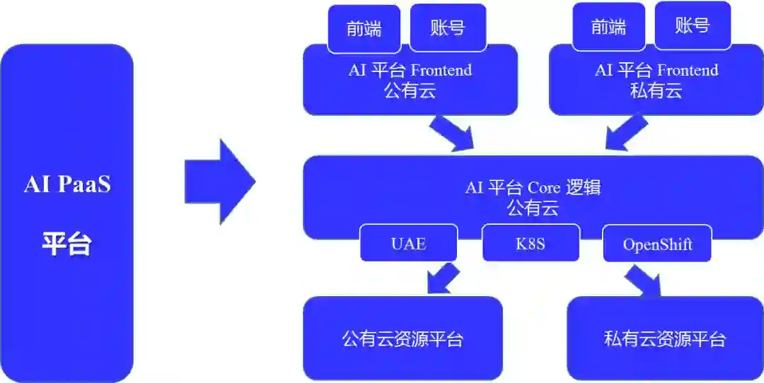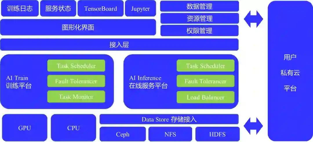 其实,私有云的AI平台构建部分与公有云很相似,从下图中我们不难看出核心层几乎是一致的。底层依赖的资源也依旧是CPU与GPU。
