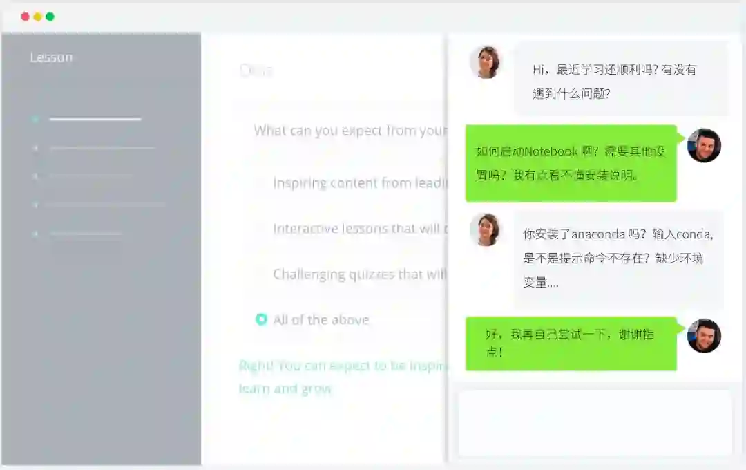每周你都有机会和导师有针对性的快速解决问题,避免了线上学习无人指导的尴尬。群内不仅有专业导师随时为你答疑解惑,还有热心小伙伴跟你一起,想打怪升级一样,一起“通关”。
