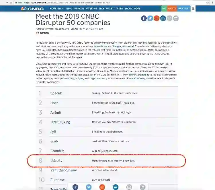 前几日(2018年5月22日),CNBC 发布了2018年 “全球50大颠覆公司”(CNBC Disrupter 50)榜单,硅谷科技教育平台 Udacity 连续 3 年登榜,位列第 8。同时上榜的 Udacity 合作伙伴还有 Lyft,Airbnb,滴滴出行和 Github。