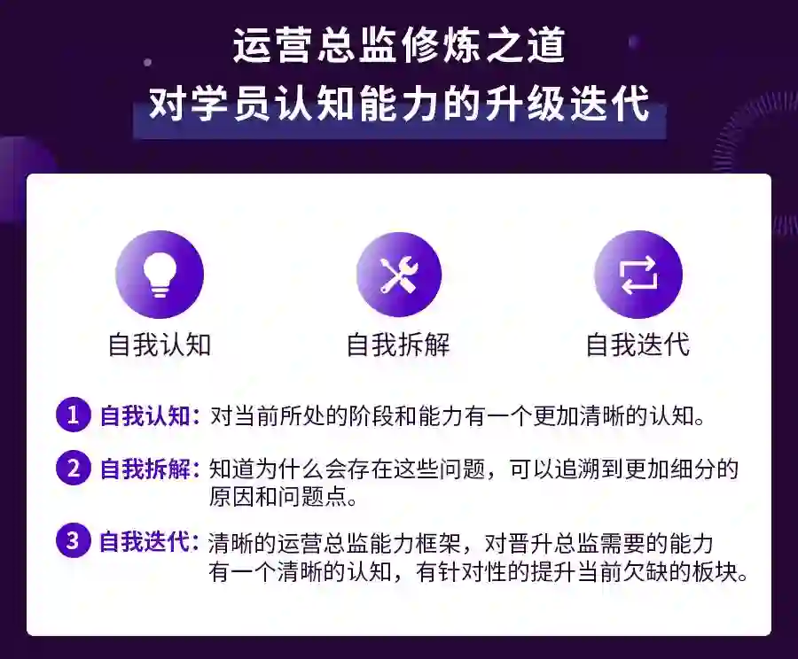 运营总监修炼之道,专为3年以上运营经理量身定制,四位授课老师通过线下面对面亲授形式,讲10年互联网的运营实战经验倾囊相授,致力于为行业运营经理的系统性成长和职场能力进阶提供更多帮助。