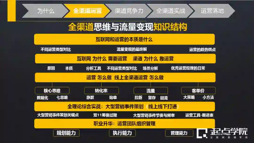 2. 深度学习运营总监必备的核心能力板块和知识框架。四大核心能力版块包括:战略规划、品牌营销、全渠道运营和流量变现、数据分析。