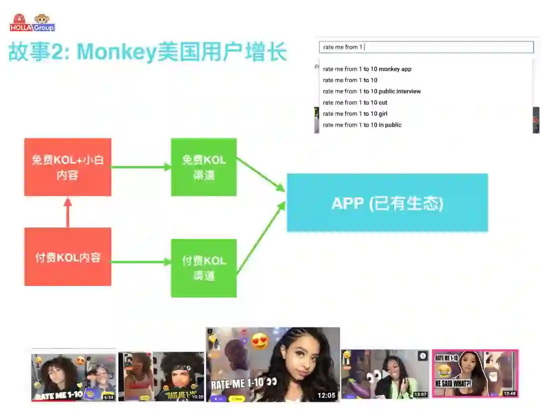 比如 「Rate Me from 1-10」 是一种在美国颇为常见的视频形式,网红跑到大街上请陌生人给自己打分,然后会出来很有意思的戏剧效果。然而如今在 Youtube 上搜索「Rate Me from 1-10」,结果排第一位的是 「Rate Me from 1-10 Monkey App」,这说明 Monkey 这款产品已经成为了 Rate me 1-10 这种视频形式的代名词,只要听到 Rate Me 1-10 就知道是用 Monkey 做的,这种现象级的效果是比较难得的,需要大量的内容做支撑。