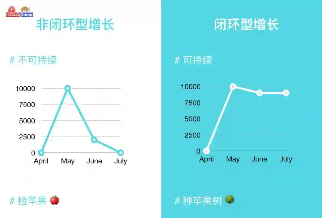 先聊聊非闭环型增长:很多人都觉得增长就是「捡红利」,从各种地方「薅流量」,这种非闭环型的增长是不可持续的,短期内会有一些爆发,但长期出爆款挑战大,难以持续。闭环型增长就如同搭建一个体系化的机器,是可以持续的产出,让流量在搭建的机器内部滚动实现正向循环。