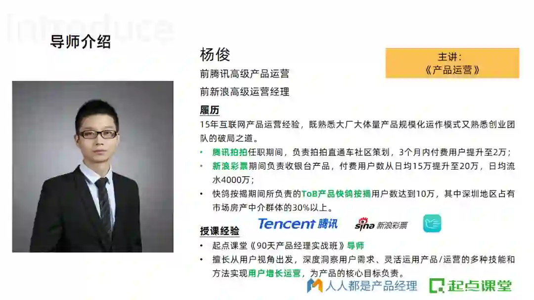 由腾讯课堂&起点课堂联合打造《90天产品经理实战班》,经过人人都是产品经理社区10年沉淀,课研部门和大厂导师几十次精心打磨,经受过市场多次严苛检验,专为转岗/入行的产品新人打造的一门能力进阶课。