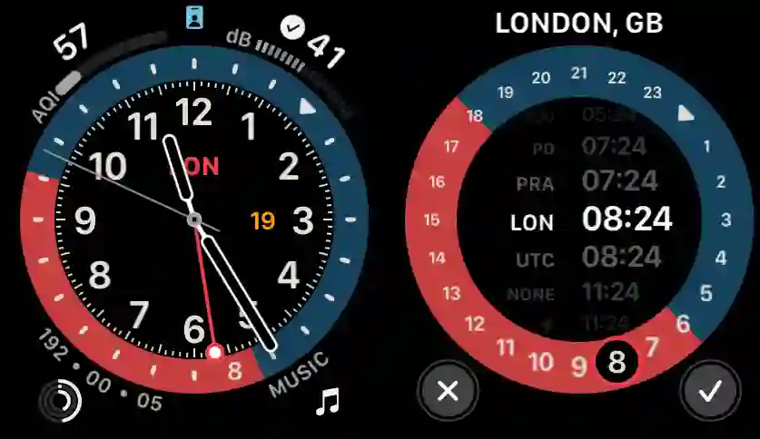 说是这么说,实际需要换算的场合并不多。这方法的本质就是自我洗脑,当然是和正常环境脱离得越久越好。除了手动换算之外还有便捷的方法,Apple Watch 上有一个表盘,可以显示另一个时区的时间,指针在表盘上并不显眼,需要的时候却能方便地找到。