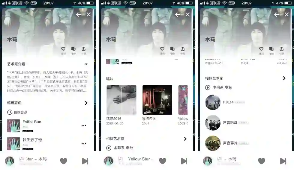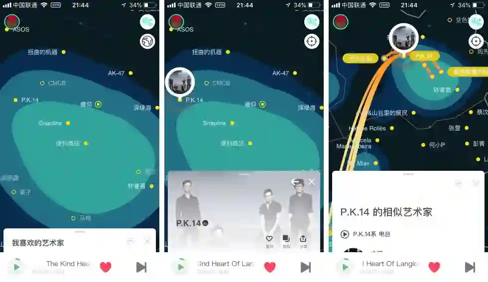 当然在同一音乐类型下,也会有很多艺术家形成群聚关系,而在音乐地图上就会显示的非常明显。如果有一块明显的亮块,那说明这一类型的艺术家你都会很喜欢,而亮块的数量其实也可以间接的展现出你喜欢的音乐领域有哪些,当你点击地图中的艺术家时,会弹出该艺术家的相关「音乐卡片」,包括该艺术家简介、精选歌曲、专辑以及相似艺术家。