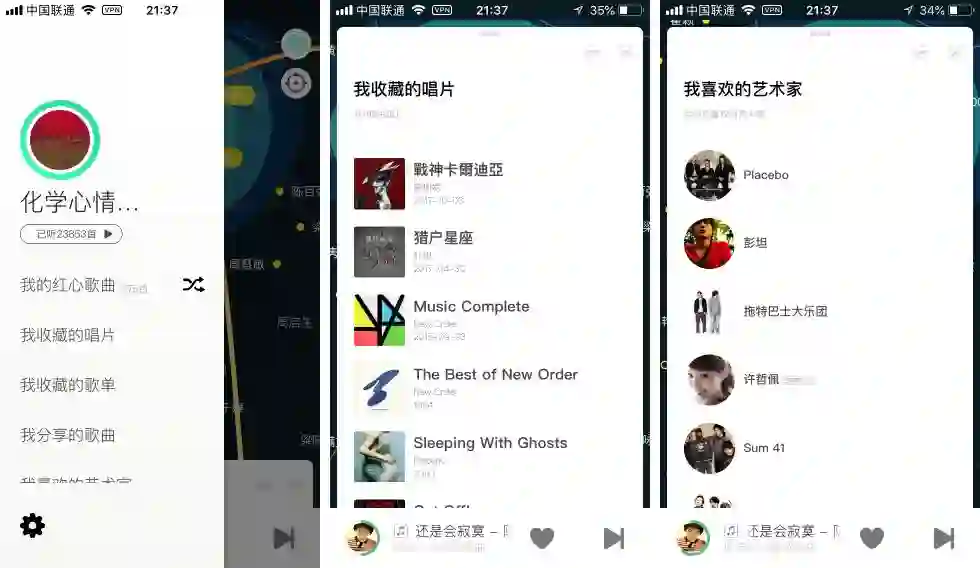 全新的卡片操作不得不说借鉴了一些操作系统的设计,打开豆瓣 FM 首先展示的是「主卡片」:豆瓣精选、私人电台以及一些针对个人听音喜好的推荐;收起卡片后点击左上角的头像会展开侧栏,选择「自己的红心歌曲」「收藏的唱片」或者「收藏的歌单」打开——毫无例外,这些展开都是一个个「音乐卡片」。