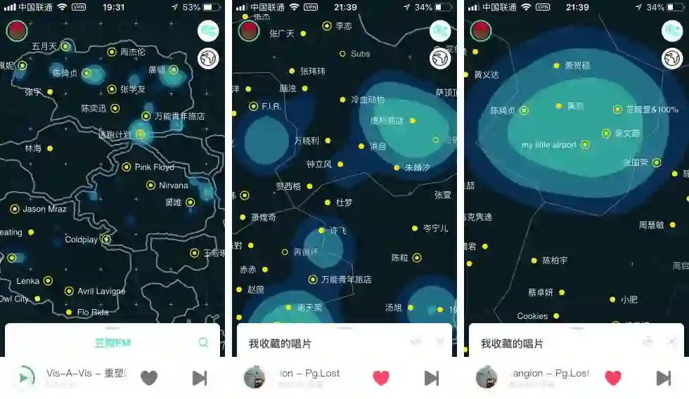 豆瓣 FM 最为强大的功能其实就是音乐推荐算法,从最初的几种音乐风格开始,你在收听「私人调频」的过程中:跳过、加入红心的操作背后,豆瓣 FM 开始逐步「理解」你的音乐喜好并且开始记录下你的「音乐轨迹」,如果这个轨迹足够大,一张音乐世界的地图就会呈现在你的面前。