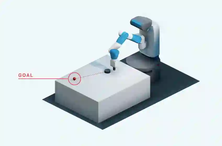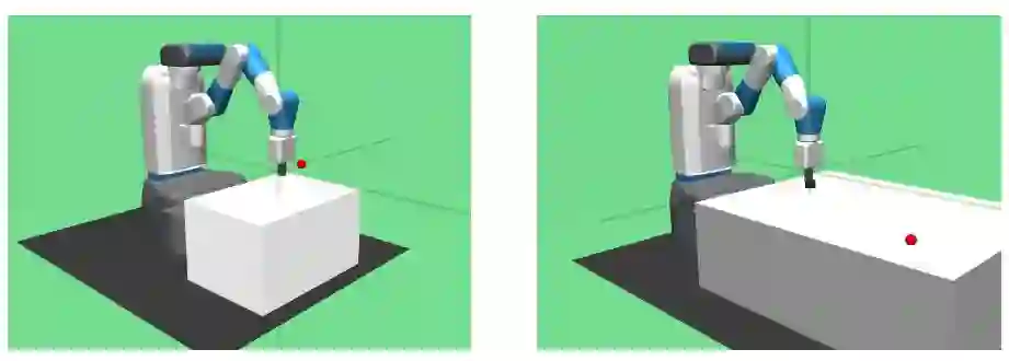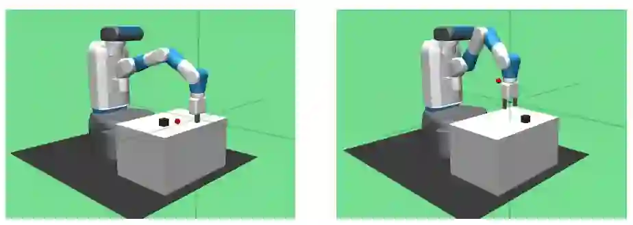 (左图)FetchReach-v0:Fetch 需要移动它的终端效应器到目标位置上。(右图)FetchSlide-v0:Fetch 需要打击一个冰球以使其滑动穿过长桌,然后停在目标位置上。