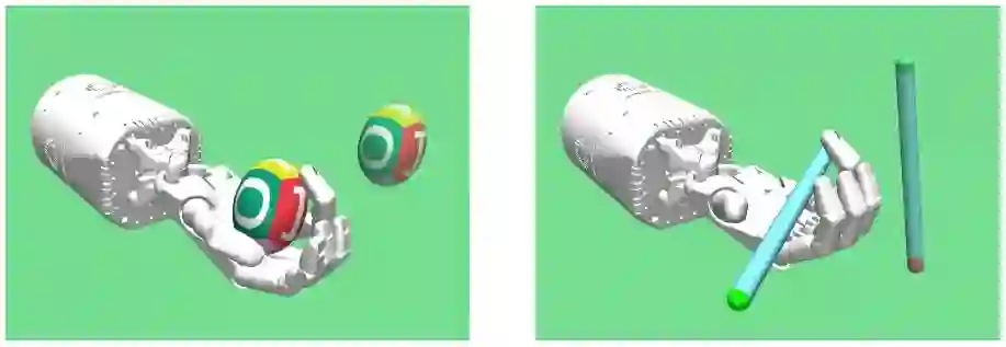 (左图)HandManipulateEgg-v0:ShadowHand 必须去操纵一个鸡蛋直到它到达了指定的地点和姿势。(右图)HandManipulatePen-v0:ShadowHand 必须去操纵一支笔直到它到达了指定的地点和姿势。