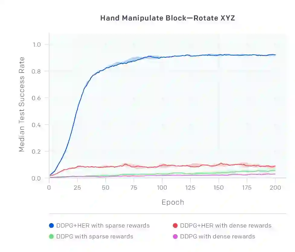带有稀疏奖励的 DDPG+HER 明显优于其它所有的配置,并且只有稀疏奖励能在这个挑战性的任务中学习到成功的策略。有趣的是,DDPG + HER 在密集奖励的情况下也能够学习,但表现并不好。此外,原版 DDPG 在两种情况下都没有较好的表现。我们发现这种趋势在大多数环境中都是正确的,读者可以在技术报告论文中查看详情。