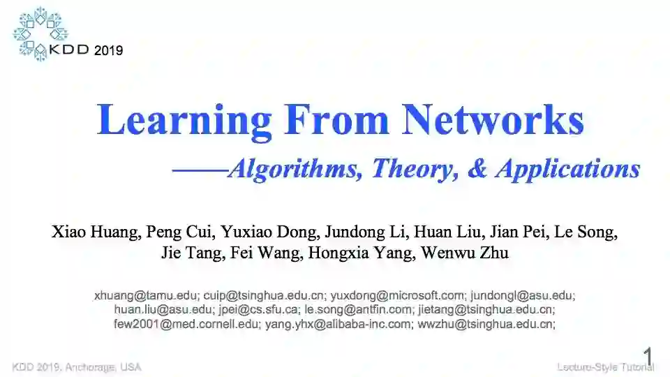 可以说,这个宇宙中的每一个实体都以这样或那样的方式联网。随着社交媒体和生物网络等网络数据收集的普及,从网络中学习已经成为许多应用中必不可少的任务。众所周知,网络数据是复杂的、大规模的,对网络数据的分析任务也越来越复杂。在本教程中,我们系统地回顾了网络学习的领域,包括算法、理论分析和演示应用程序。首先快速回顾一下该领域激动人心的历史,然后我们将阐述核心技术问题,介绍基于特征选择和基于网络嵌入的基本方法。接下来,我们将讨论属性网络的扩展,这在实践中很流行。最后,我们讨论了最新的热门话题,基于图神经的方法。对于每一组方法,我们还调查了相关的理论分析和实际应用实例。我们的教程还激发了一系列开放的问题和挑战,可能会导致未来的突破。作者是富有成效和经验丰富的研究人员活跃在这一领域,他们代表了学术界和产业界的良好结合。