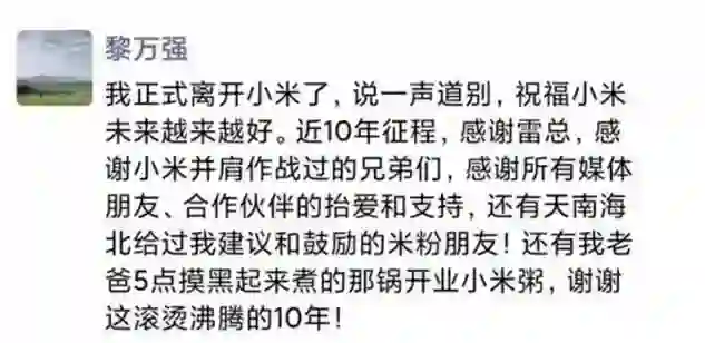 【黎万强:我正式离开小米,谢谢这滚烫沸腾的10年】11月29日,小米宣布联合创始人黎万强由于个人原因离职,改任高级顾问。随后,黎万强本人在朋友圈确认了这一消息,称谢谢这滚烫沸腾的10年。“我正式离开小米了,说一声道别,祝福小米未来越来越好,谢谢这滚烫沸腾的10年!”雷军则表示感谢阿黎创业以来的长期付出和巨大贡献。阿黎带领MIUI、小米网(小米销售与服务体系)、小米品牌市场体系等多项业务持续开荒,在商业模式验证执行、企业文化及品牌建设等多个领域,都作出了不可磨灭的贡献。(创业邦)