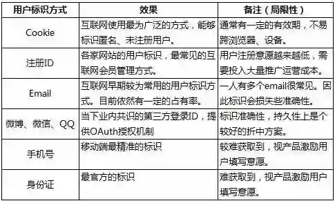 以上列举了互联网主要的用户标识方法,获取方式由易到难。视企业的用户粘性,可以获取的标识信息有所差异。