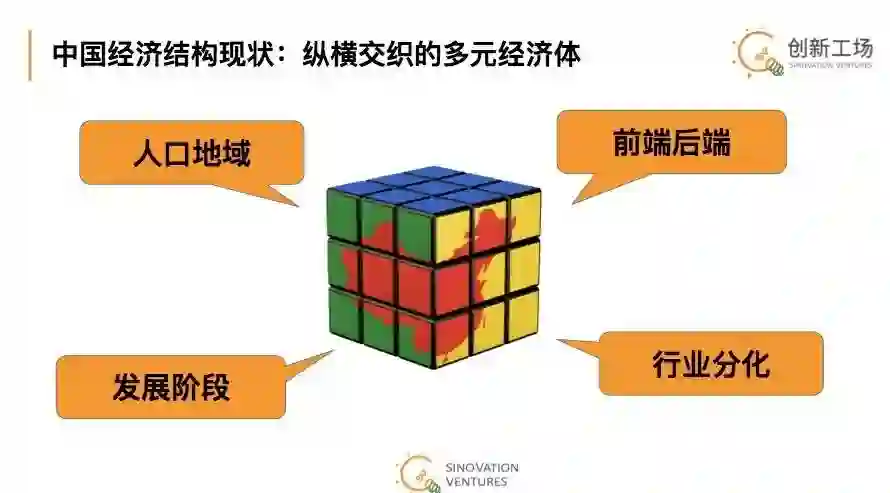 在他看来,中国不是单一经济体,它就像是一块魔方,是由人口地域、发展阶段、前端后端和不同分化的行业所分割的多元经济体。每个维度和每个不均衡都构成了新的子平台机会,市场颠覆式的机会仍在迸发。