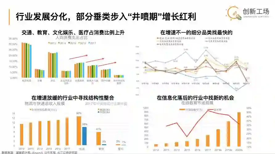 比如日常的教育,最近一两年线上教育例如VIPKID提供了一些互联网化的元素,但也要看中国几万亿的教育支出有多少程度上是被科技提升了,有多少是被在线改造,整个市场份额有多大程度的集中。