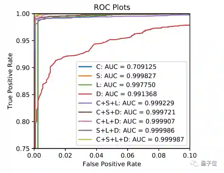 这套5个不同神经网络构成的系统在测试中取得了不错的成绩,在阈值设置为零的情况下,AUC超过0.99(ROC曲线下面积),TPR为0.994(真阳性比率)。
