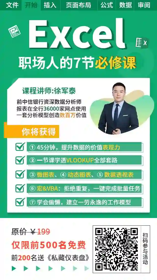 年终收官福利,前500名免费学习课程,200名还有精美Excel仪表盘赠送。
