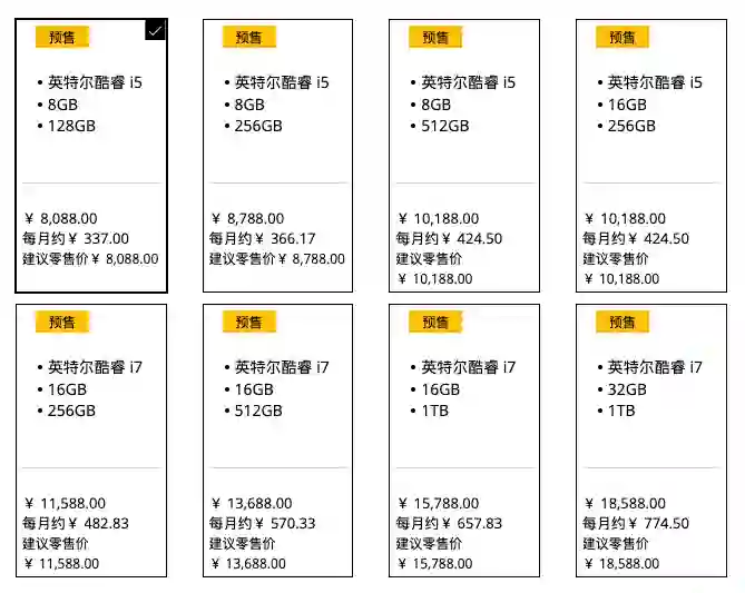 -i5+8GB+128GB 版本售价 8088 元,i7+32GB+1TB 版本售价 18588 元,均不包含键盘盖和手写笔。