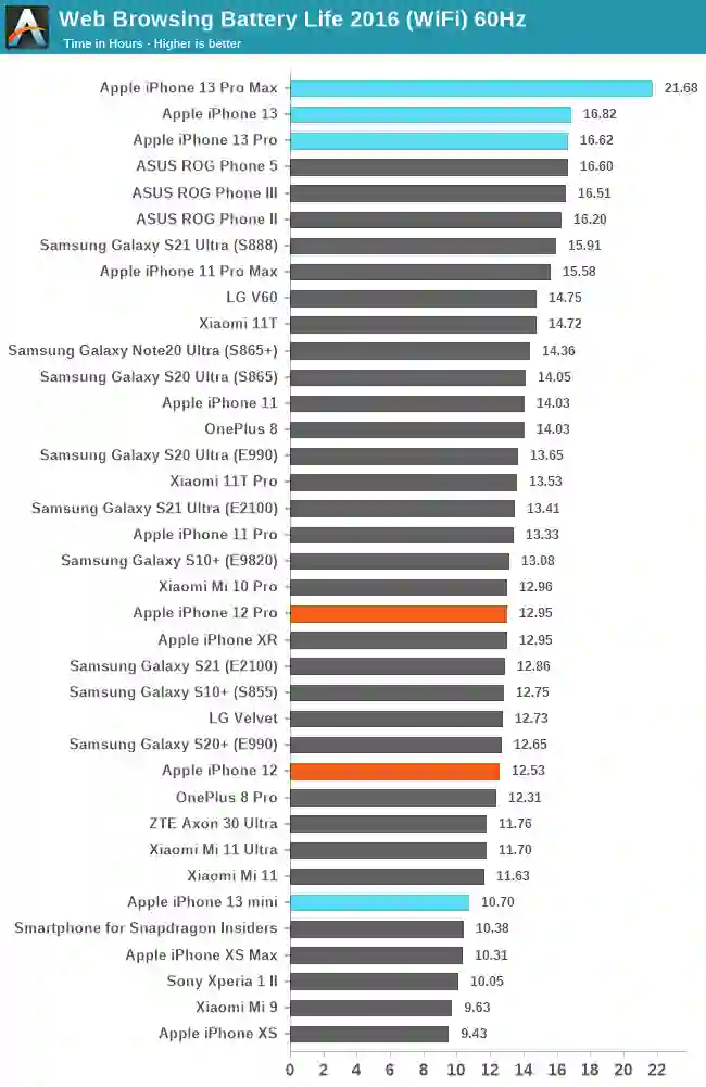 昨日,外媒 AnandTech 发布关于测试 iPhone 13 系列电池寿命文章,通过数据分析可知,在 60Hz 标准刷新率下 iPhone 13 Pro Max 达到了 21.68 小时,远超其他任何机型;iPhone 13 Pro、iPhone 13 紧随其后,领先了 ROG 游戏手机 5、三星 Galaxy S21U 等长续航机型,而 iPhone 13 mini 表现一般,仅坚持 10.7 个小时。