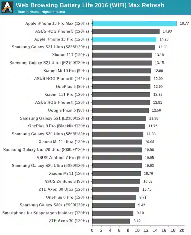 随后,在 120Hz 刷新率下,iPhone 13 Pro Max 依然位居第一,跑出 18.77小时,iPhone 13 Pro 也坚持了 14.20 个小时。两款机型相比 60Hz 刷新率下,分别损失 13.5%、14.5% 的续航时间,苹果新机的寿命优势还是比较突出。