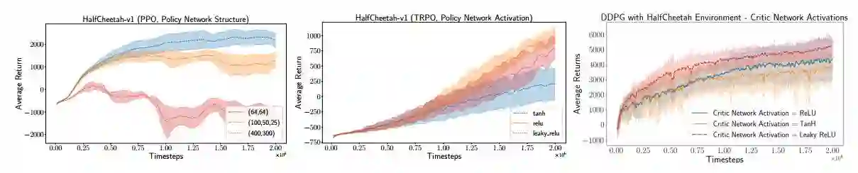 基于实验结果和调研,我们可以提出一些通用建议。不同的超参数在相同的算法和环境中可以产生截然不同的影响,因此通过标准优化和超参数搜索找出与原报告中基线算法性能匹配的工作集非常重要。同理,新的基线代码库(baseline codebase)需要匹配原代码库的结果。总体而言,由于强化学习算法的试验与随机种子有很大的差异性,在比较性能时,许多试验必须使用不同的随机种子运行。通过不同随机种子平均多次运行可以深入了解环境中算法性能的总体分布(population distribution),除非随机种子的选择是算法的明确部分。
