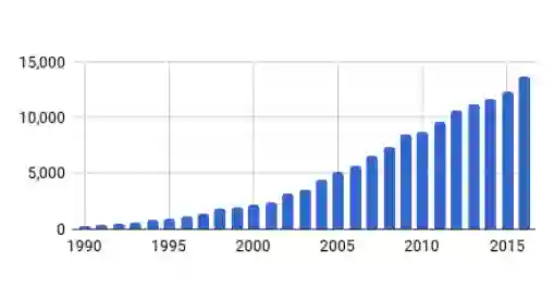 图 1:已发布的强化学习论文增长趋势图,展示了每年(x 轴)强化学习相关论文(y 轴)的数量。