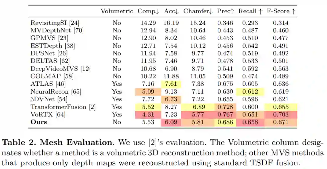 该研究使用 TransformerFusion 建立的标准协议进行 3D 重建评估,结果如下表 2 所示。