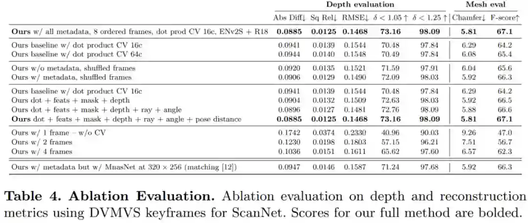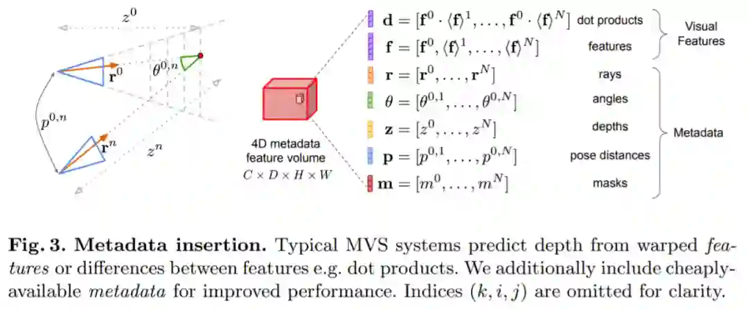 该研究的关键是将现有的元数据与典型的深度图像特征一起注入到 cost volume 中,以允许网络访问有用的信息,如几何和相对相机姿态信息。图 3 详细地显示了 feature volume 构造。通过整合这些之前未开发的信息,该研究的模型能够在深度预测方面显著优于之前的方法,而无需昂贵的 4D cost volume 成本、复杂的时间融合以及高斯过程。