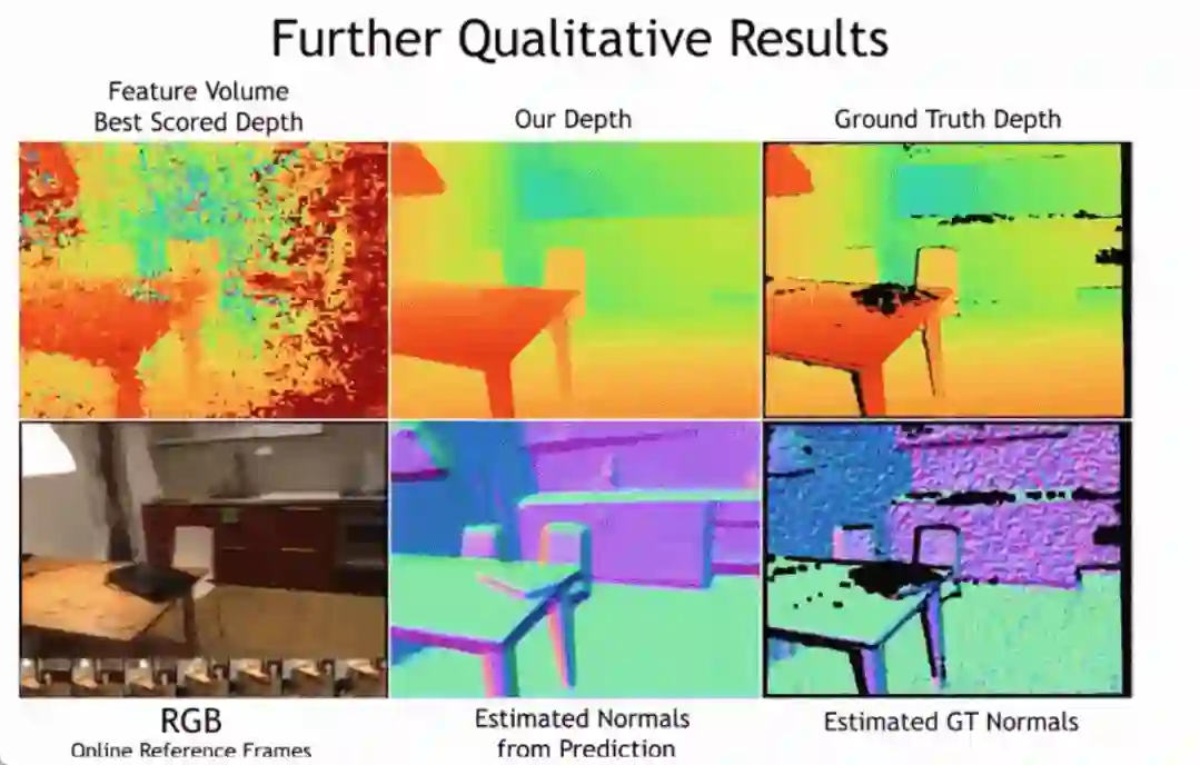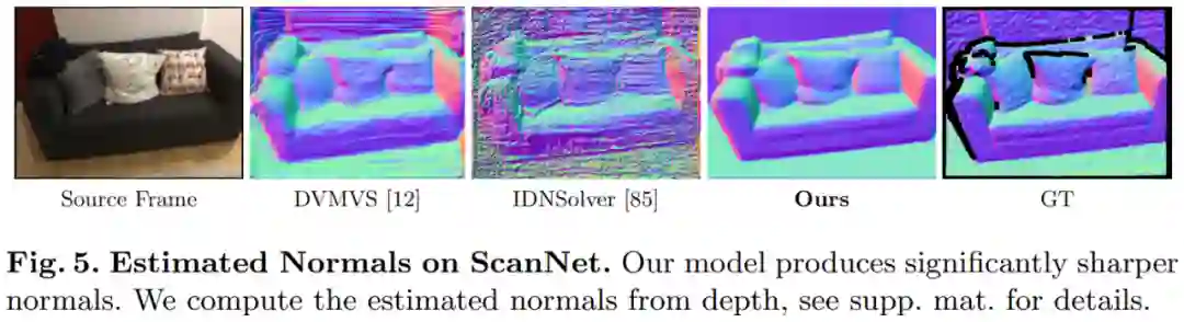 令人惊讶的是,该研究所提模型不使用 3D 卷积,在深度预测指标上却优于所有基线模型。此外,不使用元数据编码的基线模型也比以前的方法表现更好,这表明精心设计和训练的 2D 网络足以进行高质量的深度估计。下图 4 和图 5 显示了深度和法线的定性结果。