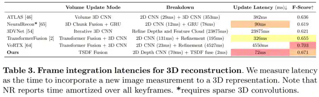 对于在线和交互式 3D 重建应用,减少传感器延迟是至关重要的。下表 3 展示了给定一个新的 RGB 帧,各个模型对每帧的集成计算时间。