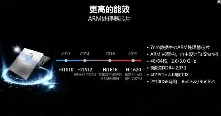 而另外一个亮点是,邱隆也展示了首个基于 Arm 架构发展的服务器计算芯片,并自主设计了基于 Arm V8 架构的 TaiShan 核心,基于 7nm 工艺制造,最大提供到 64 核配置,并支持双 100GE 网络和 8 通道 DDR4-2933,在算力上拥有不逊于业界竞争对手的表现。