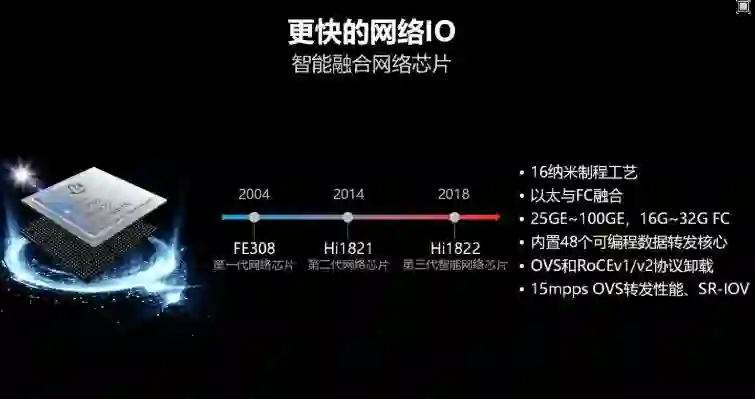 另外,华为也在大会上发表了新一代智能网络芯片,基于 16nm 工艺制造,实现了以太与光纤通道融合,并内建 48 个可编程数据转发核心。