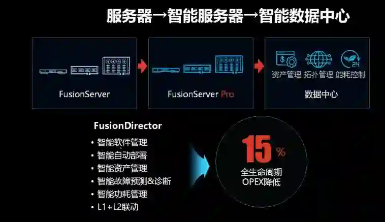 华为智能计算业务总裁邱隆也在会议上正式宣布,智能数据中心以及服务器基础设备:FusionServer Pro,通过全智能化的管理和部署能力,达到更好的生命周期,以及更低的管理成本。