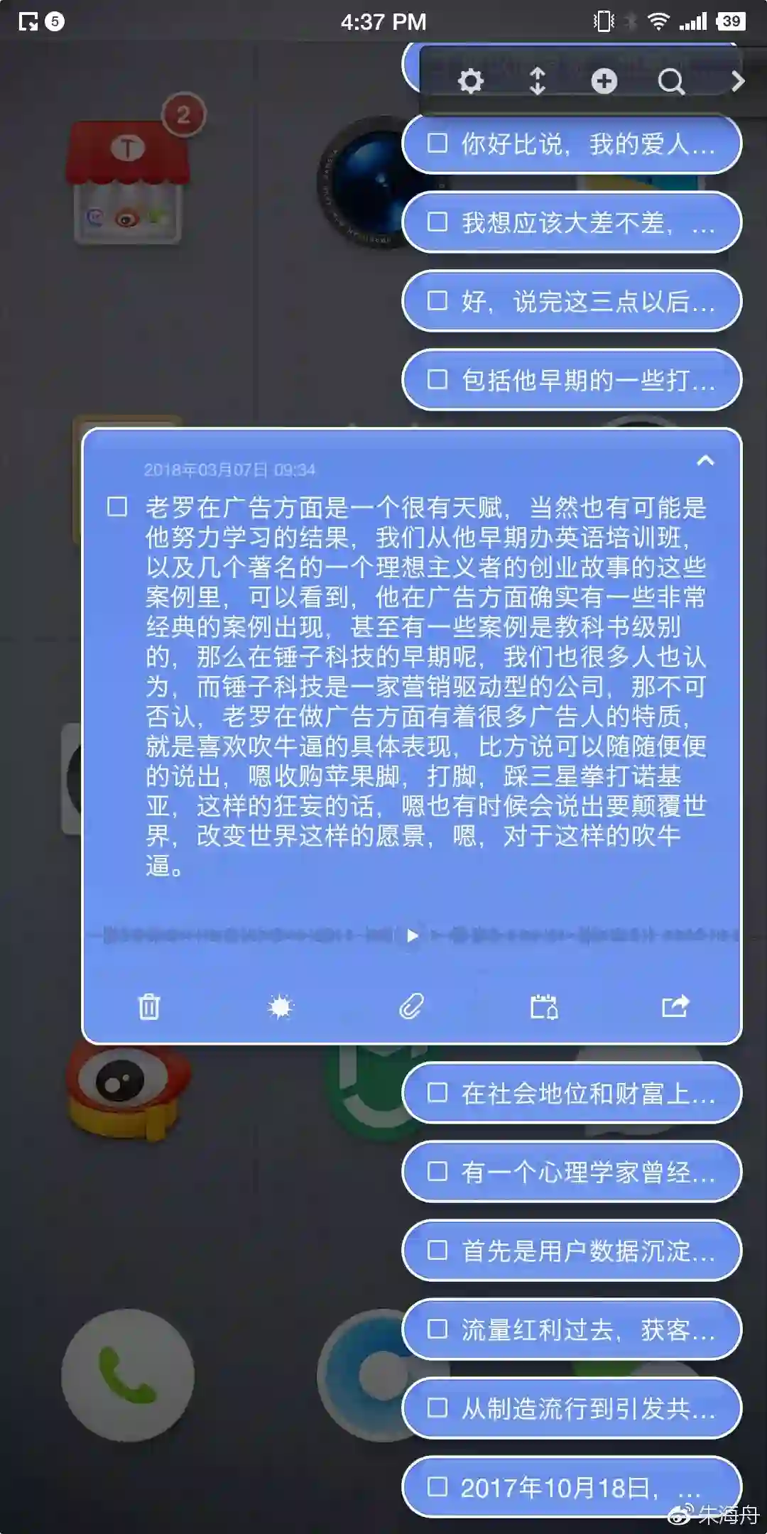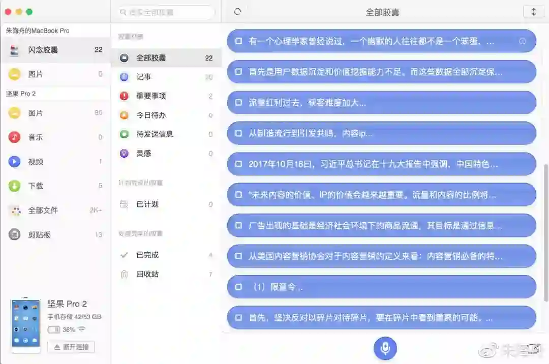 闪念胶囊刚出来的时候的,只是一个语音备忘录,然后经过这些年的发展,逐渐变成了一个集合GTD、Workflow类的一个综合APP,这也算不上什么新事物,毕竟有用这类软件的朋友,手机里肯定有替代品。