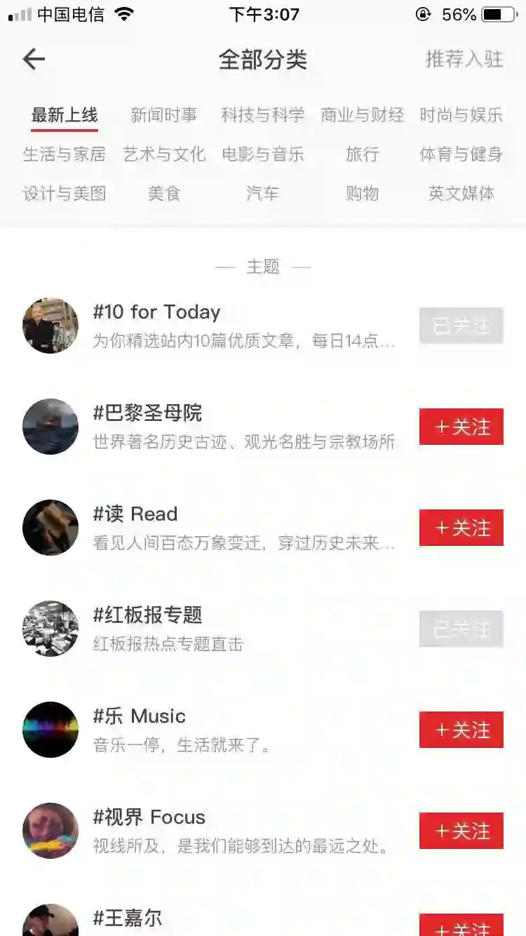 5.【主题和媒体】中会出现用户在进入App前勾选的相关主题,点击相关主题,用户将可以浏览到与该主题相关的文章,用户可以自行选择关注或取关。点击右上角的【+】将会出现全部分类好的主题及媒体,用户可以根据自身需求来选择自己感兴趣的主题和媒体,从而实现个性化阅读。