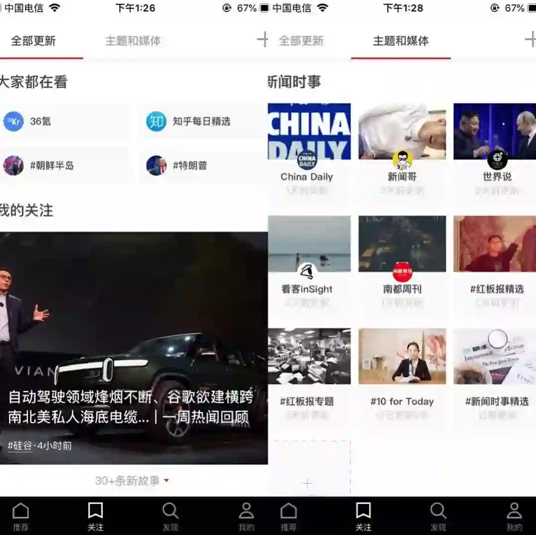4.底栏的【关注】分为【全部更新】和【主题和媒体】两大块。如果说【推荐】里用户看到的是算法推荐的优质内容,那么在【全部更新中】会呈现给用户的就是用户在进入App前勾选关注的相应主题下的相关文章。【大家都在看】里每更新一次页面都会轮番滚动呈现不同的媒体平台或话题供用户勾选,底下同样是以大图冲击视觉的方式呈现的文章。