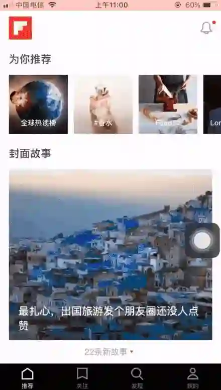 3.首页的屏幕的下方显示的是“封面故事”,一张大图占据了手机屏幕的一大半,左下角是文章标题,在一定程度上造成了视觉冲击,吸引读者阅读。点开文章之后,新用户会收到点击左上角处的指示,引导用户可以改变文章字体大小。
