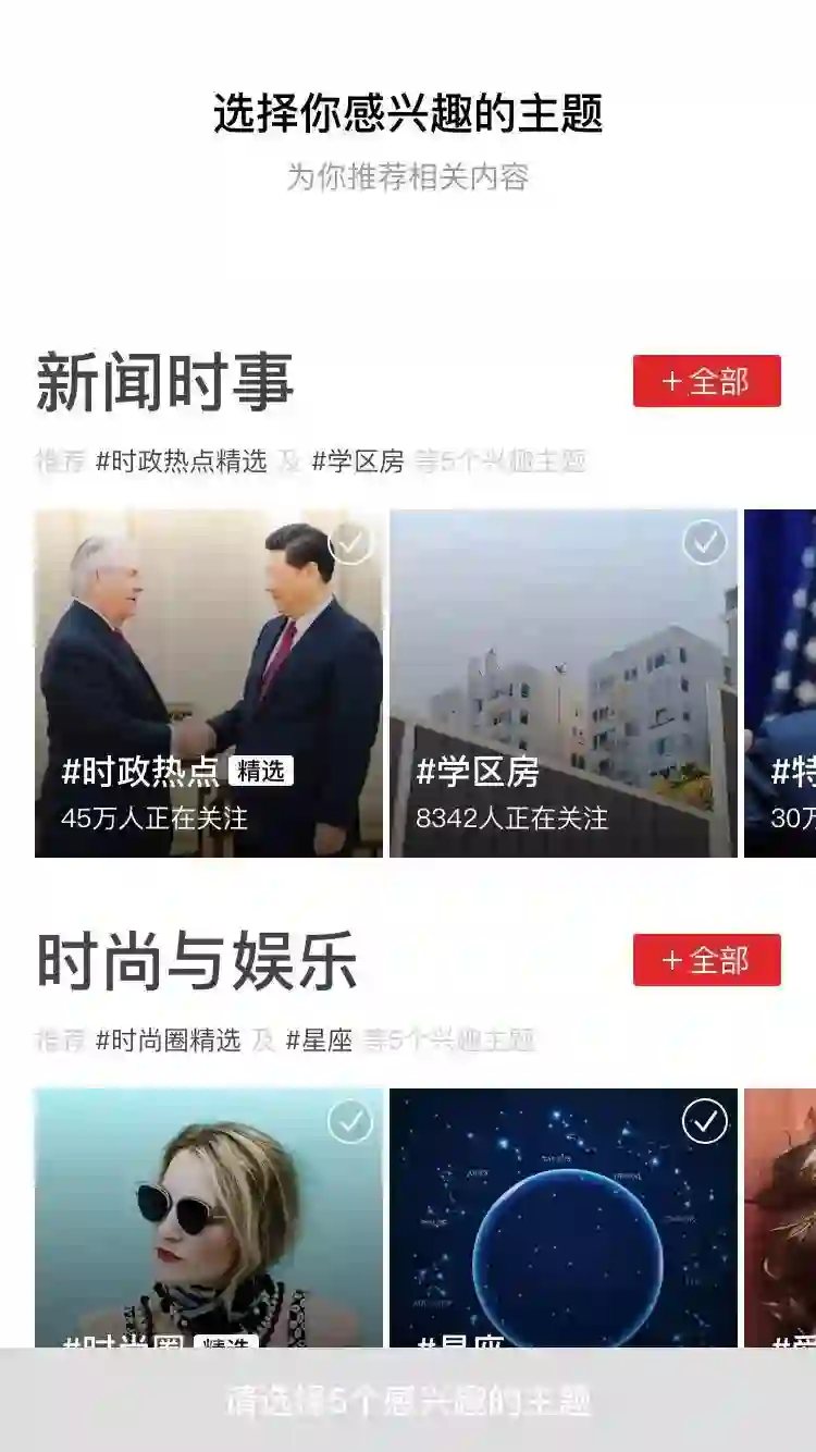 1.下载后,界面会向用户提供几个大类主题,包括新闻时事、时尚与娱乐等。这些大主题下又细分为不同的主题,如在时尚与娱乐这个大主题下又分了#时尚圈、#星座等,用户可以根据自己的兴趣爱好去勾选相应主题,也可以点击所属类别主题右边的“+全部”按钮进行全部勾选。