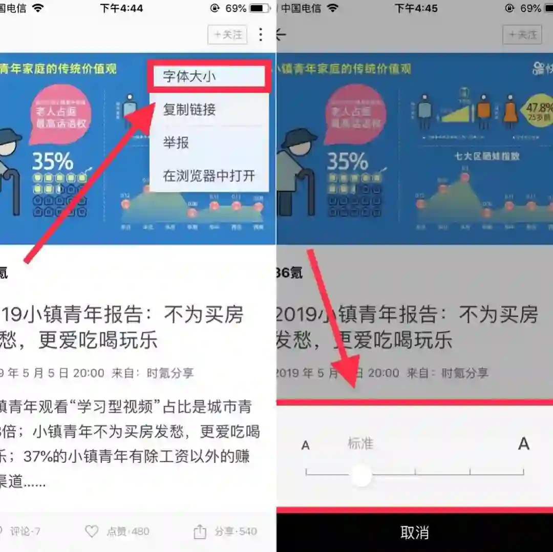 相比于大多数新闻客户端和公众号阅读,字体的大小往往是固定的,由产品统一字号。而红板报可以自定义字体大小一举也可以满足不同用户对字体大小的需求。