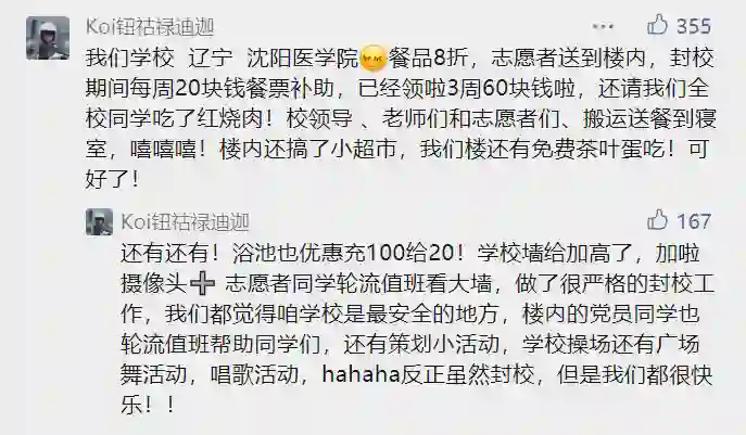 也有网友表示,学校封校时很注重学生的生活和心理健康,各种补助吃饭、策划小活动等,让大家虽然在封校,但依旧很快乐!