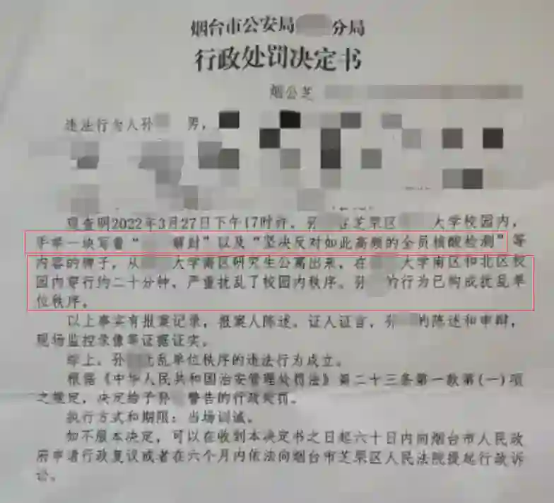 在学校的校园南区和北区穿行。公然反对和抵制校园封闭管理以及全员核酸检测,因为严重扰乱了校园管理秩序,被公安机关强制带离。