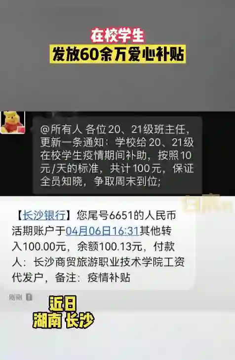 当然,有的学校就做的很好,小募注意到,近日,湖南长沙一高校为确保学生疫情期间的生活质量,为在校的6000余名学生发放了60余万元的爱心补贴。