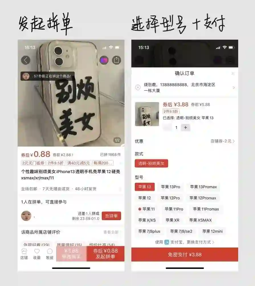 拼多多下单路径:点击拼单- 选择型号(弹窗)- 免密支付。一共3步,打开1个弹窗,没有打开新页面。