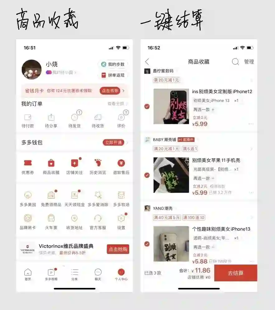 细心的人会发现,拼多多收藏的icon是一个购物袋+一颗心,也就是说拼多多是把购物车和收藏的功能合并了,如此做,也是是想强化“即买即走”的属性,弱化“购物车”功能。所以拼多多不是没有购物车,它只是没有“我们认知里”的购物车。