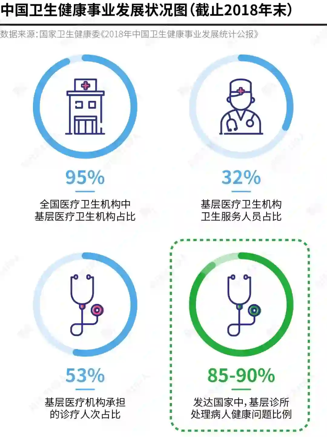 一组广为流传的数据:2018年末,全国医疗卫生机构中基层医疗卫生机构占比约95%,但它们仅拥有全国32%的卫生服务人员。在发达国家,基层诊所能处理病人85%-90%的健康问题,国内只有53%的诊疗人次由基层医疗机构承担。(数据来源:国家卫生健康委《2018年中国卫生健康事业发展统计公报》)